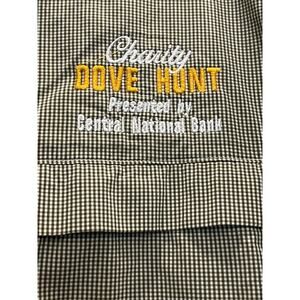 " Charity Dove Hunt presented by Central National Bank" on left chest above pocket. also embroidered with " Baylor Scott& White Health" on left sleeve.