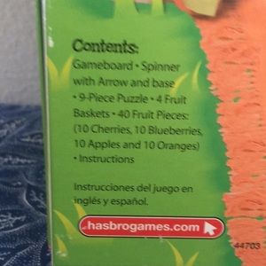 The game contains cherries in 4 colors, a game board, 4 plastic baskets,