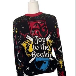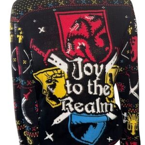 Celebrate the season with the Joy to the Realm black sweater. Perfect for adding a festive touch to your wardrobe.