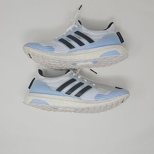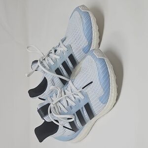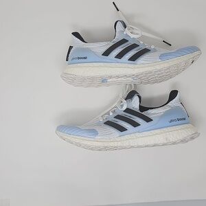 adidas Ultra Boost 4.0 Game of Thrones White Walkers. This sneaker comes with white upper plus blue accents, three black adidas stripes, a white midsole, and a white sole. These sneakers were released in March 2019 and retailed for $180