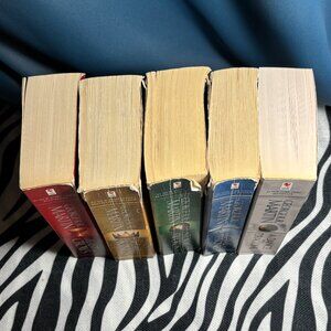 Books 1-5 with cardboard box set display holder. Books 1-4 are well used and in fair condition with visible wear. Book 5 is in excellent condition. The copy of Storm of Swords has a large tear in the front cover. Otherwise, pages are in good condition.
