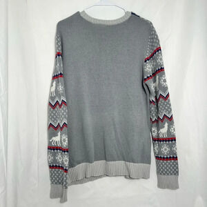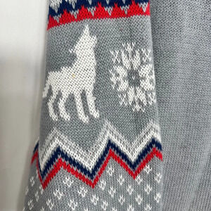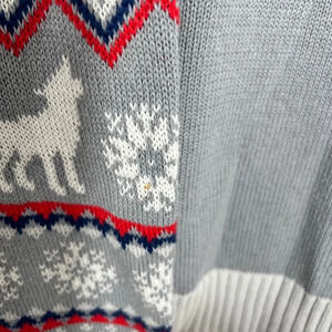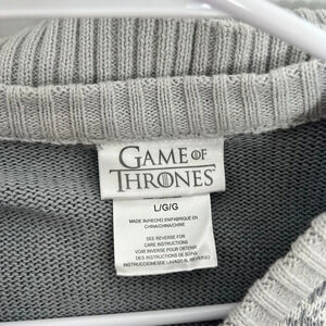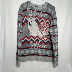 Game of Thrones "Winter is Here" sweater. It is a grey sweater with a white direwolf, red and blue chevron patterns, and white snowflakes. The sweater is made of a soft, knitted fabric. It has long sleeves and a crew neck. Size large. It is definitely oversized. Has a couple minor small stains on the sleeves as shown in photos.