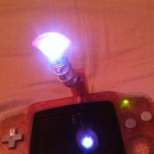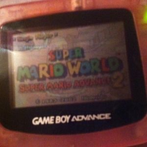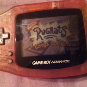 Pink transparent gameboy advance, matching bendable screen light, carrying bag, Rugrats I Gotta Go Party, Super Mario World Super Mario Advanced 2, charger thats missing cord. The gameboy advanced takes two AA batteries, but they made a special plug-in that had a cord that you could plug into to your car or the wall and play without batteries. I have the plug-in but i don't have the cords. Everything works perfectly!
