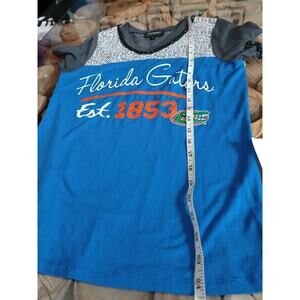 Gameday Couture University of Florida Gators V-neck T-shirt Blue Gray XS, in good pre-owned condition: no holes, no stains, moderate wear, pilling, wear on jewels on sleeves, has not been recently cleaned, stale from storage. Marked as a women's XS, measurements are taken while laying flat and are approximate: (see photos)
