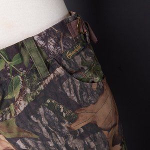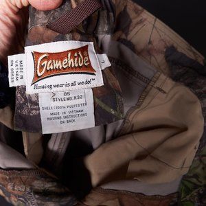 The pants are in great condition. They are made by Gamehide. Solid camo print with adjustable sides and a elastic back for perfect fit. There are 2 side cargo pockets, 2 hip pockets one back pockets. Cord at the ankle to tie for snug fit. Marked a size L and measures 34 cm across waist, 26 cm rise and 70 cm inseam