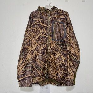 Shadowgrass camouflage harvester jacket with removable hood. Wind proof and water resistant outside shell and high nap Sherpa on the inside. Worn about 3 times. Great for hunting.