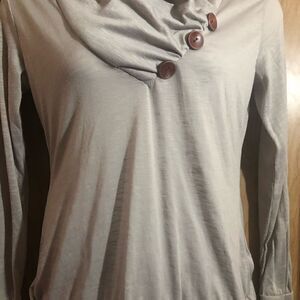 Gamiss cowl neck long sleeve shirt. Size XL. Gray. Bandeau hem. Cute buttons at the neckline. Material may be polyester. Tag is missing. Very cute. Preowned excellent condition