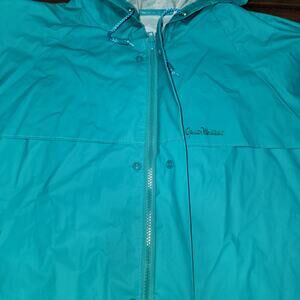 Gander Mountain Full Zip Teal Hooded Long Rain Coat - Size Men's Reg Large. Excellent condition. Comes from a smoke free home.