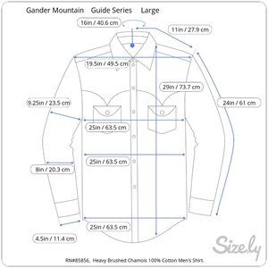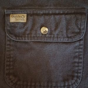 Gander Mountain "Guide Series" Chamois Brushed 100% Cotton Shirt, Heavy weight with Double Stitching Seams. Button Down, Dark Blue, Open Collar with slightly round edging. Has 2 large sports rounded pockets with button flaps. Yolk back with pleat, and hang loop. Shirttail hem. Pleated Sleeves with with Button Opening; and 2 Button Cuffs for Comfortable Fix. This Shirt is Slight Fading but Very Little Wear on the Fabric From Normal Wear. There is a Lot of Life Left in This Shirt. Great Wardrobe Choice for the Man who Enjoys the Outdoors, Hunting, Fishing, Wood Cutting, Ranching, Farming,or Work Shirt. Relax fit.