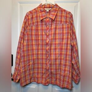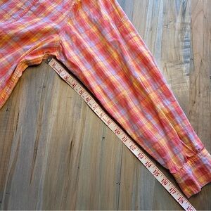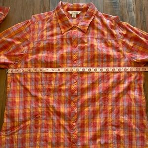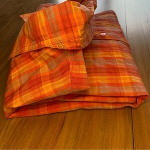 Vibrant plaid snap button-up shirt featuring orange and yellow hues. Perfect for casual or outdoor activities. ~Sleeves can convert to short. 1 zip pocket on right front. 92% cotton & 8% nylon.