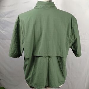 This Gander Mountain Guide Series button down, green, short sleeve cropped shirt is a size Medium. It had two flap velcro chest pockets in front with zippered pocket as well. Back wind vent in back. Pre-owned and in excellent condition. All offers welcome.