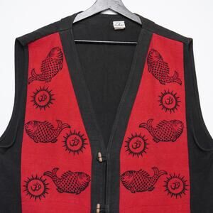 Ganesh Himal Handmade Nepal Cotton Vest XL Black-Red Fish “Om” Print Boho