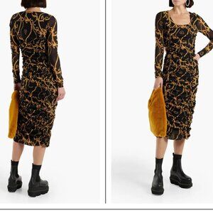 Ganni Baroque-Print Black Mesh Ruched Midi Long-Sleeved Dress Size 6