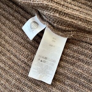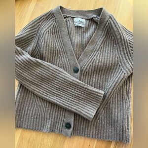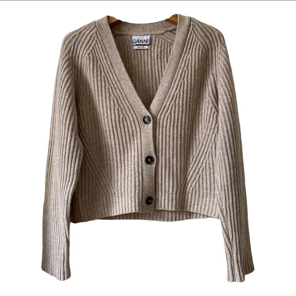 Soft ribbed knit cardigan by Ganni. V-neck with three-button front. Long sleeves and relaxed fit. Neutral beige tone. Classic, versatile layering piece.