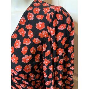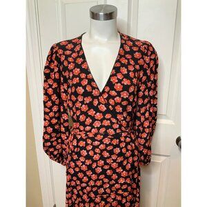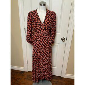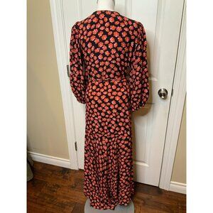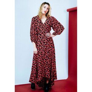 Ganni Black & Dark Pink Floral Print Long Wrap Dress, Size 2 | 34
