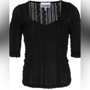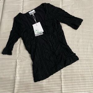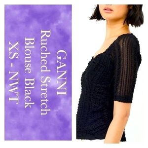 XS - Ganni Women’s Top Black Stretch Lace Ruched Blouse Popover NWT