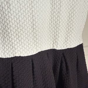 Chic Ganni dress in a striking black & white colorblock design with heavy knit texture. V-neck, short sleeve, flattering pleated skirt. High-quality construction made in Turkey. Timeless mod vibe for day-to-night looks.