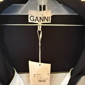 Chic Ganni jacket with striking white and yellow accents on a black background. Ideal for a modern style.