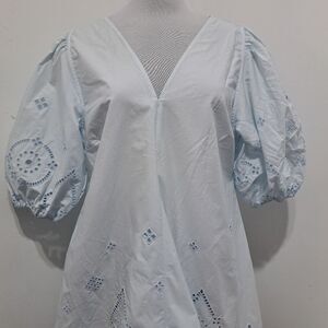 Ganni Broderie Anglaise Puff Sleeve Organic Cotton Mini Dress Illusion Blue Size 42 US 10 NWT