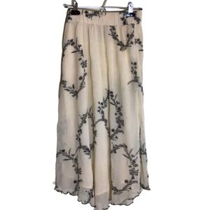 This dreamy maxi skirt from Ganni features delicate black floral embroidery on airy, crinkled pale yellow chiffon. Crafted from 100% recycled polyester, it offers a floaty silhouette, an elastic waistband, and sustainable style in true Scandi fashion. The embroidery includes “GANNI” stitched subtly into the pattern.