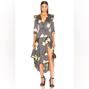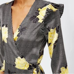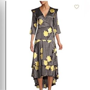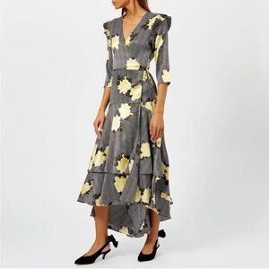 Ganni Calla Yellow Floral Silk Wrap Dress Assymetrical Ruffle Hem Size 40 US 10