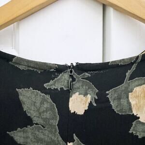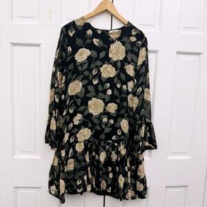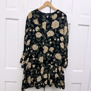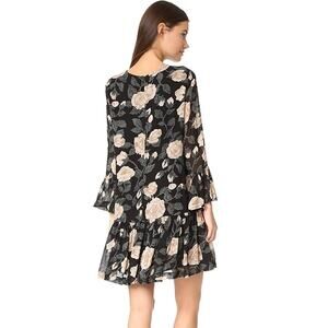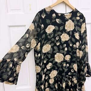 Carlton Georgette Dress by Ganni in Black is a crepe, long sheer sleeve dress with an all over rose pattern. It features a straight, drop-waist that ends in a swingy ruffle skirt. Lined.