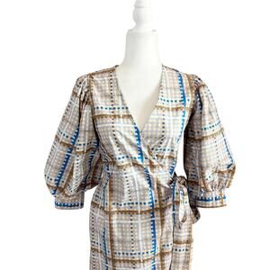 ganni, wrap dress, checked dress, cotton midi, puff sleeve, balloon sleeve, scandinavian style, danish design, day to night, sustainable fashion, effortless chic, modern classic, blue brown, C0
