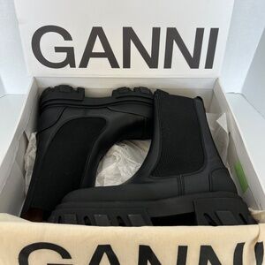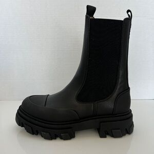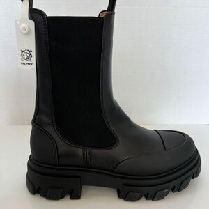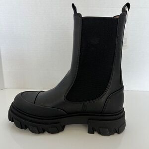 New in box with tags and storage bag. Black Leather. Stretch panels with pull tabs.