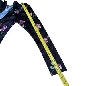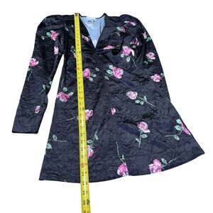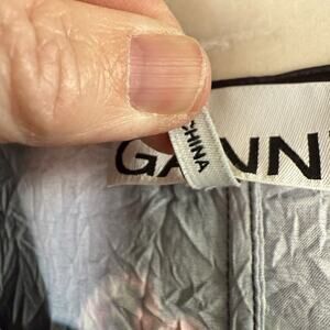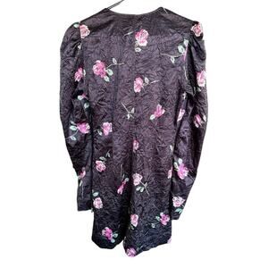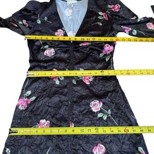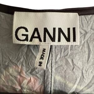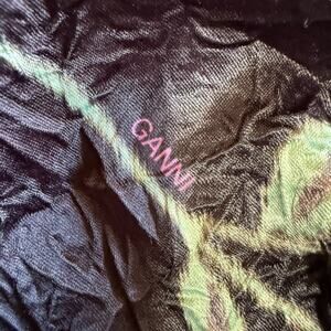 The Ganni Crinkled Satin Minidress is a black, size 36 dress made of polyester and spandex. It features a V-neckline, long puff sleeves, and a zip closure. The dress has a floral pattern and is lightweight and machine washable. It is suitable for weddings, parties, and casual events, and has accents including a zipper. The dress is a shift style and has a short length, making it appropriate for beach, biker, and city themes. It is not vintage or handmade, and does not come in a personalization option.