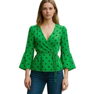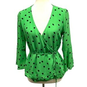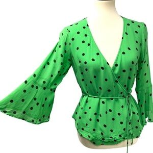 Ganni Dainty Georgette Green Polka Dot Bell Sleeve Wrap Top Women’s EU 36