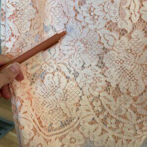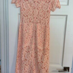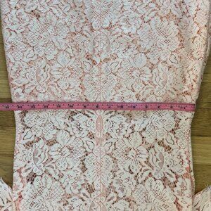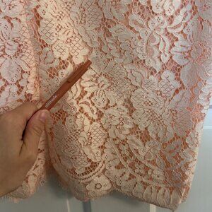 Romantic blush pink lace with sheer sleeves and scalloped hem. Worn once, great condition with 2 minor spots that I haven't attempted to get out (see pictures). Perfect for weddings, cocktail parties, or special events.