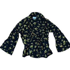 Ganni floral crepe wrap top in black with yellow floral pattern. Size womens 32 and fits like a small. Quarter fleeces and frill at the bottom. Beautiful paired with black pants or jeans.