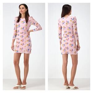 This is a fun bodycon dress in printed mesh in our new season print, finished with a crew neckline and 3/4 sleeves. Gathered ruching runs down each sleeve, princess seam, and center back for a slim flattering silhouette. Fits true to size.