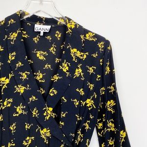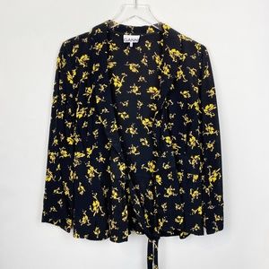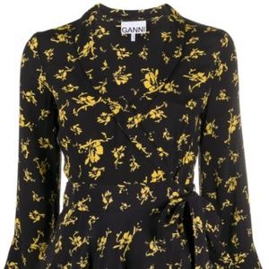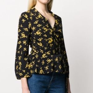 Ganni Floral Wrap Blouse Black Yellow Crepe 38
