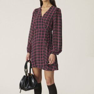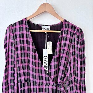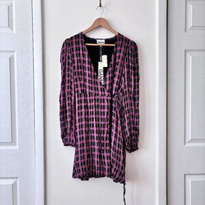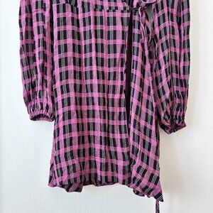 Feel amazingly comfortable and sexy this season in this vibrant dress by Ganni. This mini-length dress is a wrap style with v-neckline, long blouson sleeves, and a bright pink and black check print. Perfect for your next party event.