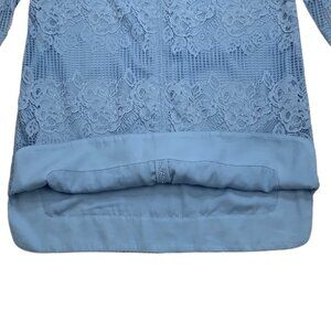 This Ganni Lace Mini Dress makes a statement due to it's sheer lace puff 3/4 sleeve, overlay lace fabric, front henley style zipper, partially lined, shift silhouette, mini hem with side slits, belt loops and blue shade.