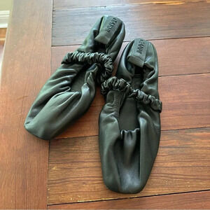 GANNI's ballet flats have a partially folded design, which means they can be effortlessly slipped into your tote bag and changed into later. They're made from supple black leather and accented with a scrunchie-inspired strap for a playful finish.