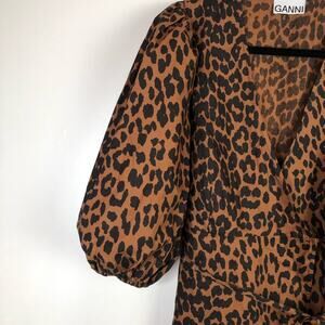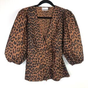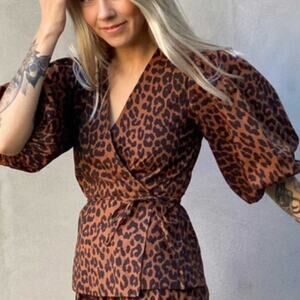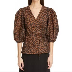Ganni Leopard Print Balloon Sleeve Wrap Front Top