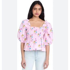 Ganni Lilac Floral Smock Top Square Neck Puff Sleeve Spring Size 44 New V13