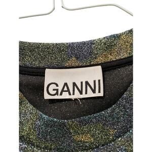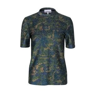 Ganni Green Gold Blue Print Metallic Crew Neck Short Sleeve Shirt Top Size 34