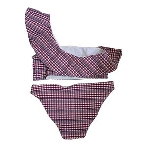 Classic seersucker bikini in a gingham pattern. One shoulder ruffle top, classic bottom