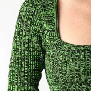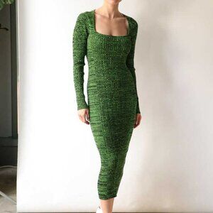 This Green Melange Knit Dress is designed for a form-fitting silhouette in ribbed knit and features a square neckline and long sleeves.