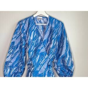 Ganni Metallic Jacquard Long Balloon Sleeve Mini Wrap Dress Blue Women Size 36/S