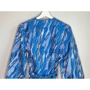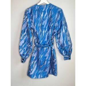 Ganni Metallic Jacquard Long Balloon Sleeve Mini Wrap Dress Blue Women's Size 36
