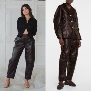 Ganni Mid Rise Wide Leg Barrel Lamb Leather Mole Brown Pants Size S
