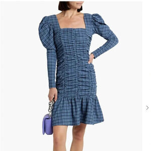 Ganni Mini DressRuched Checked Stretch Seersucker Blue Black New Size 34 US 4