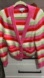 Vibrant striped cardigan with pink, red, and green hues. Features a cozy knit and button closure. Perfect for layering.