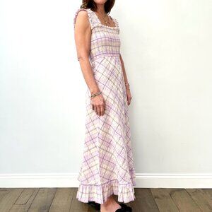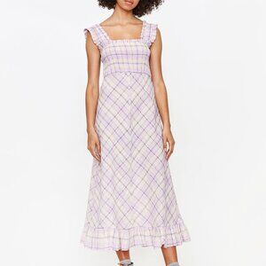 Ganni NWT EU 44 XL Smocked Seersucker Check Midi Dress Lilac Orchid Ruffle Strap