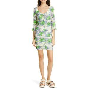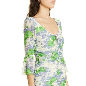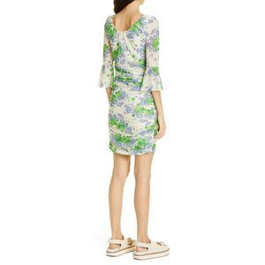 Ganni NWT Floral Ruched Bell Sleeve Printed Mesh Mini Dress in Egret size 6 EU38