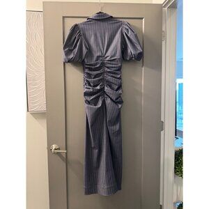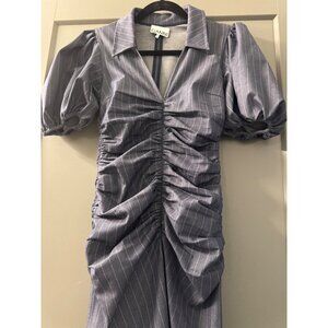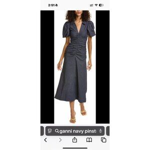 Ganni Navy Pinstripe Midi Dress With Ruched Waist & Puff Sleeves